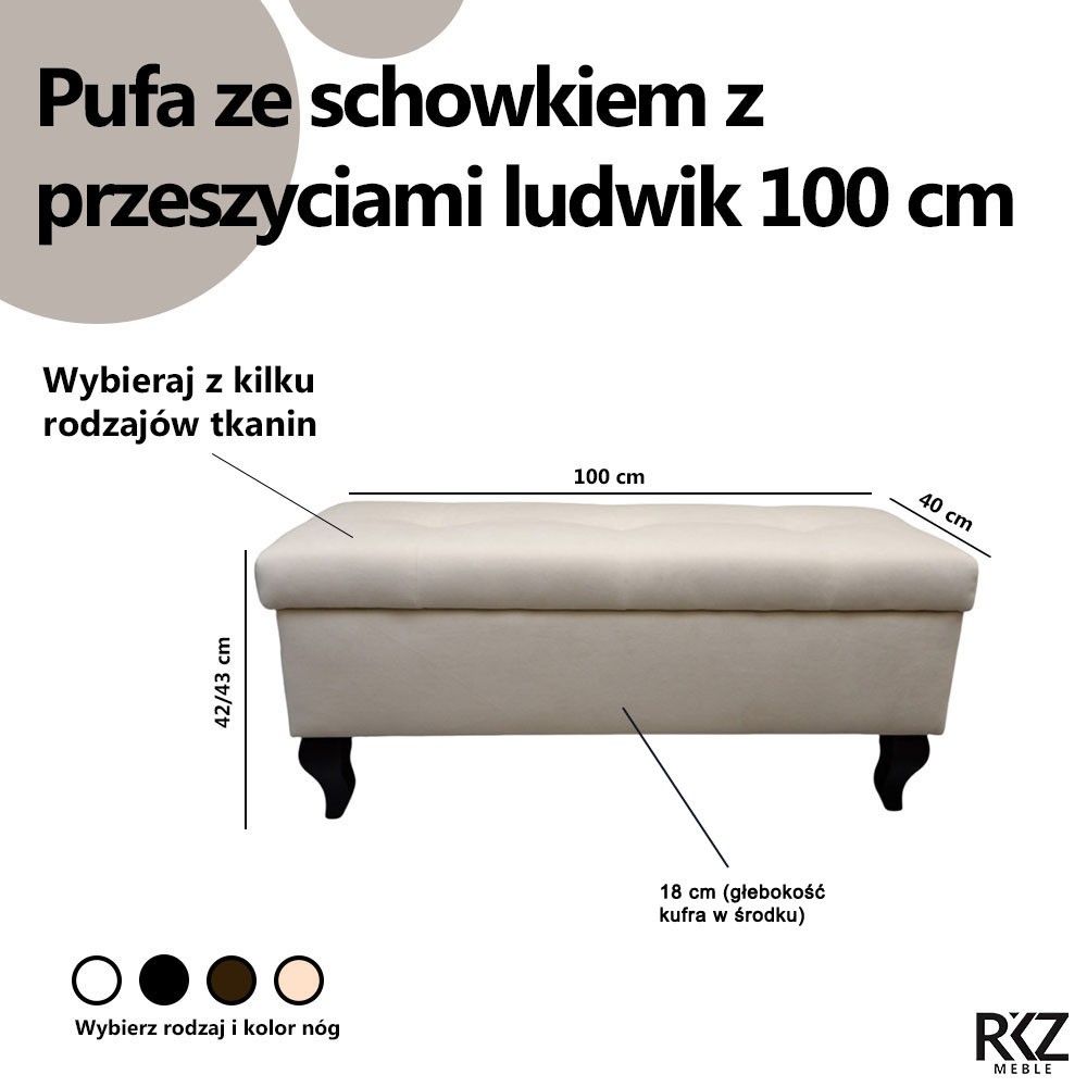 Prostokątna pufa ze schowkiem 100cm z nogą Ludwik to elegancki i stylowy mebel, który wpasuje się niemal w każdą przestrzeń. Idealnie nadaje się jako pufa do przedpokoju, biura, gabinetu, czy pokoju dziecięcego. Przeszycia oraz welurowa tkanina dodają siedzisku eleganckiego wyglądu, a schowek pozwala na przechowywanie wszelkich drobiazgów w Twoim pomieszczeniu. Dodatkowo, noga Ludwik, która charakteryzuje się oryginalnym, barokowym kształtem, dodaje meblowi unikalnego charakteru.